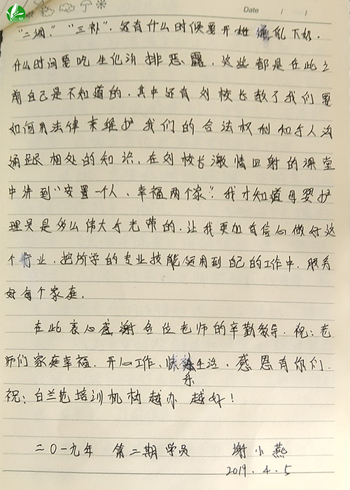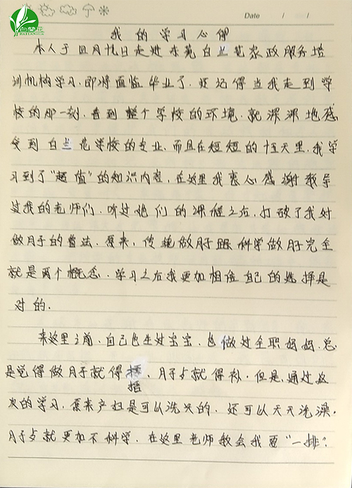 本人在东莞白兰花职业培训学校学习,即将面临毕业。还记得当我走进学校的那一刻,看到整个学校的环境,就深深地感受到白兰花学校的专业,而且在短短的十五天里,我学习到了"超值"的知识内容,在这里我衷心感谢教导过我的老师们,听过她们的课程之后,打破了我对做月子的看法。原来,传统做月子跟科学做月子完全就是两个概念,学习之后我更加相信自己的选择是对的。